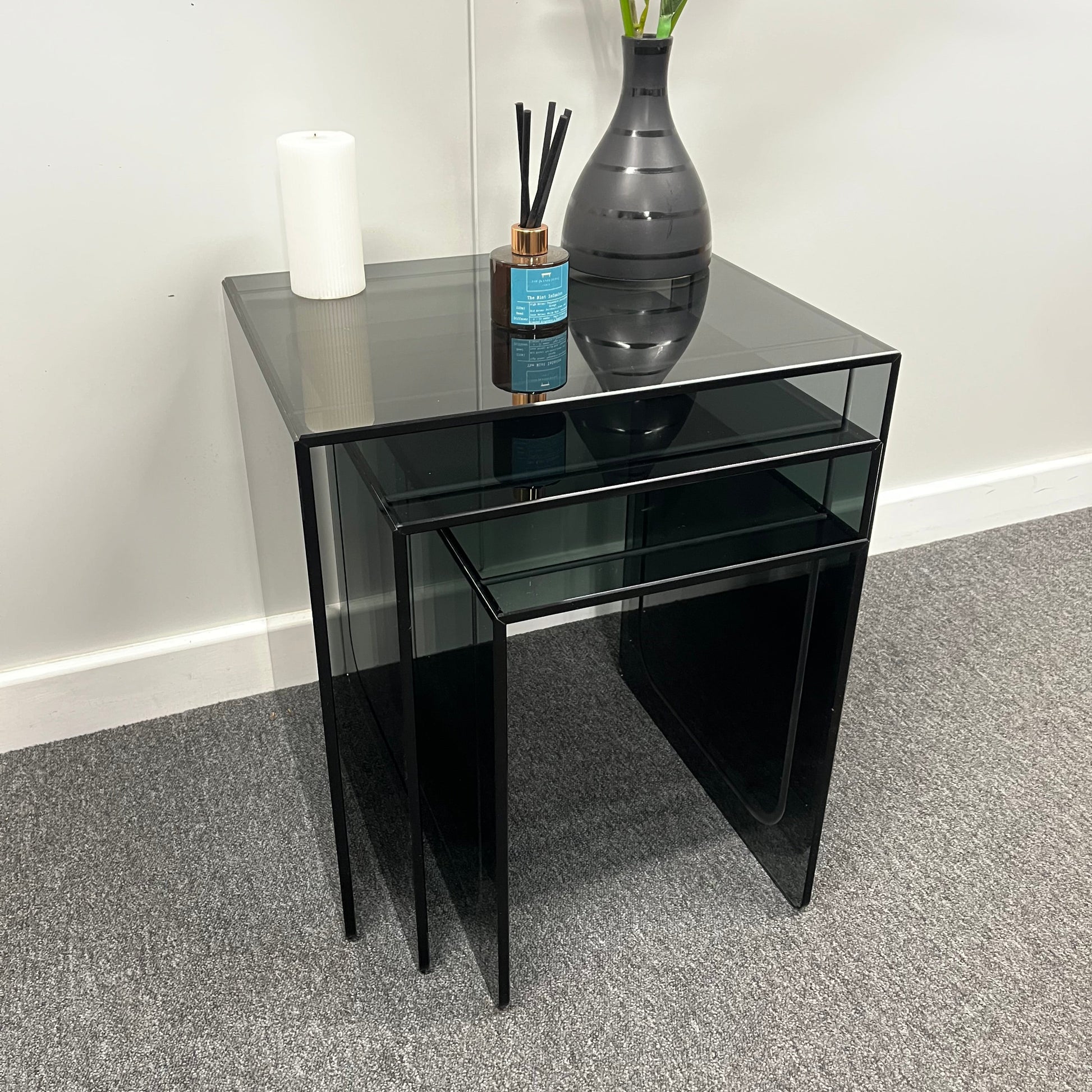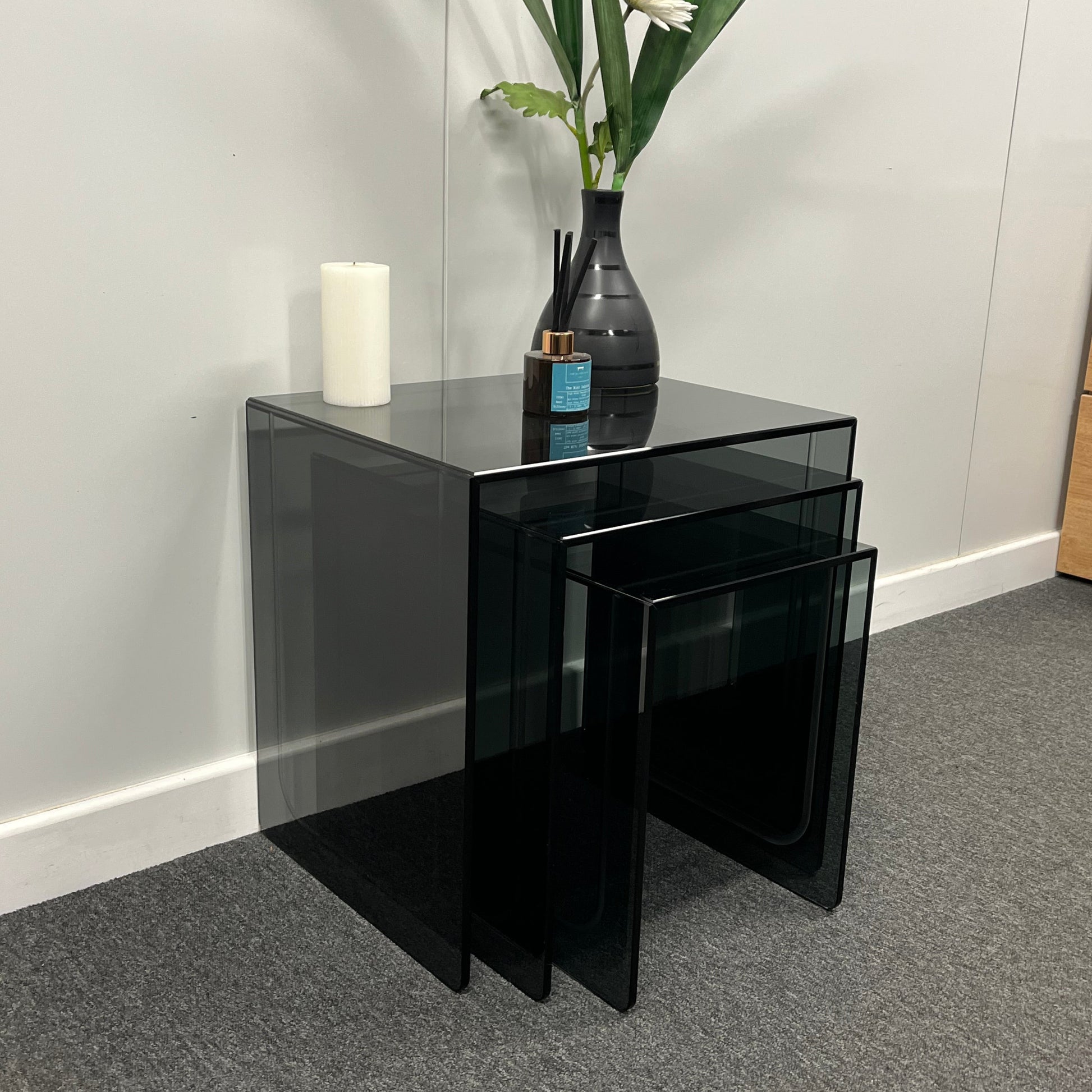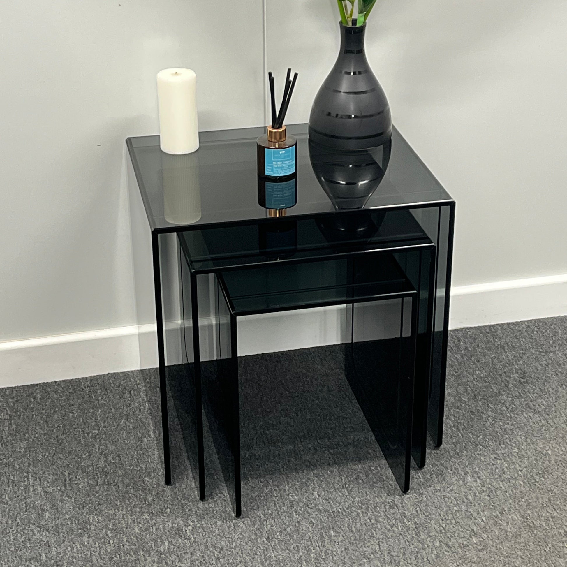 Modern Smoked Glass Nesting Tables – Set of 3 | 10mm Tempered Grey Tint Glass, Frameless & UV Bonded