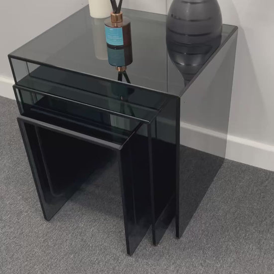 Add refined modern style to your home with this elegant set of 3 smoked glass nesting tables, expertly manufactured in Yorkshire, UK. Crafted from 10mm tempered grey tint glass, each piece offers strength, sophistication, and timeless minimalist design.
